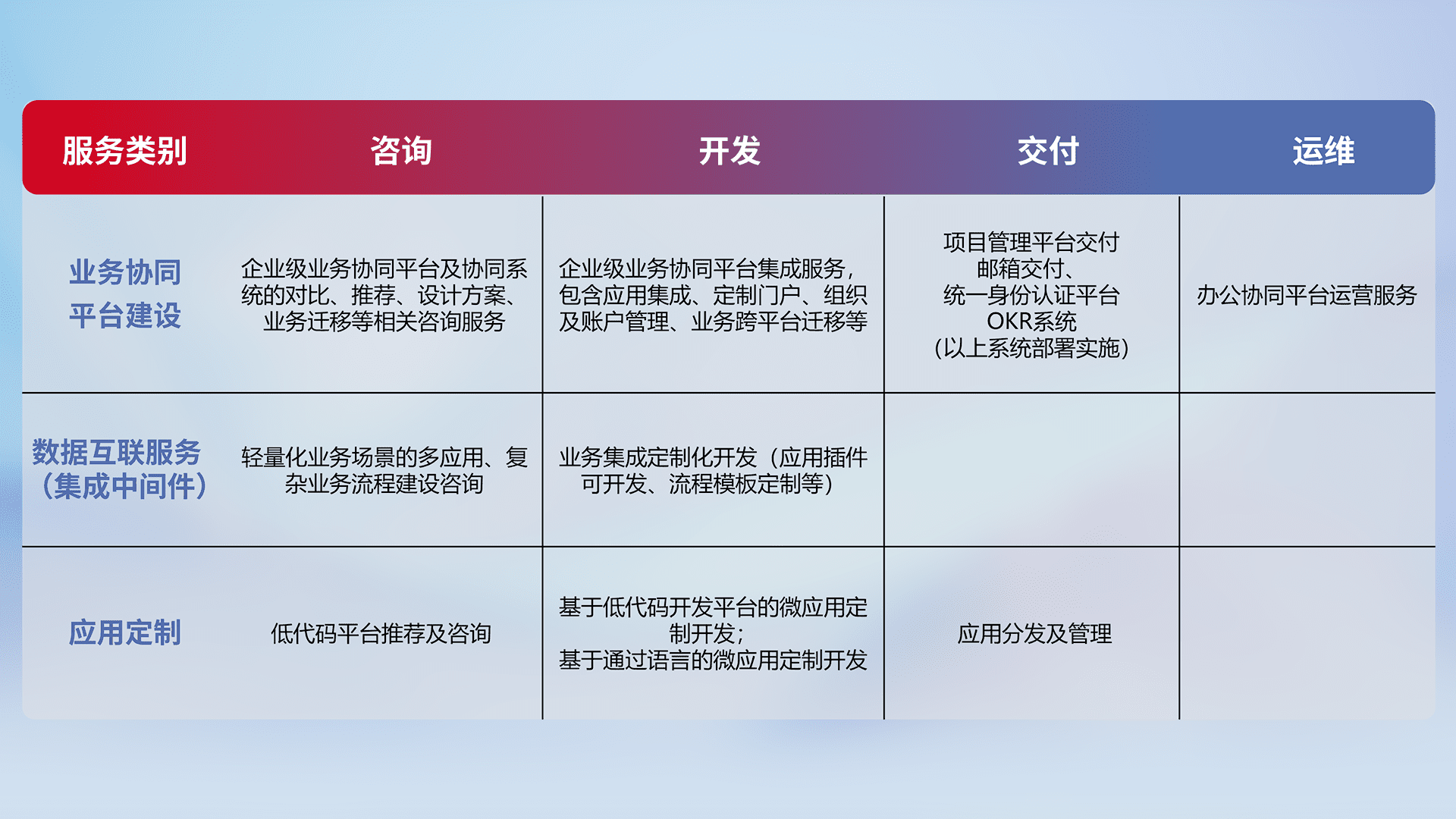 针对钉钉、、、、企微、、、、IDaas等平台级产品提供产品的规划、、方案、、、交付、、定制化开发等服务,,,实现如统一协同办公、、、智能客户服务、、混合会议管理、、、、智能数据查询、、、等业务场景,,实现数字化转型。。。。