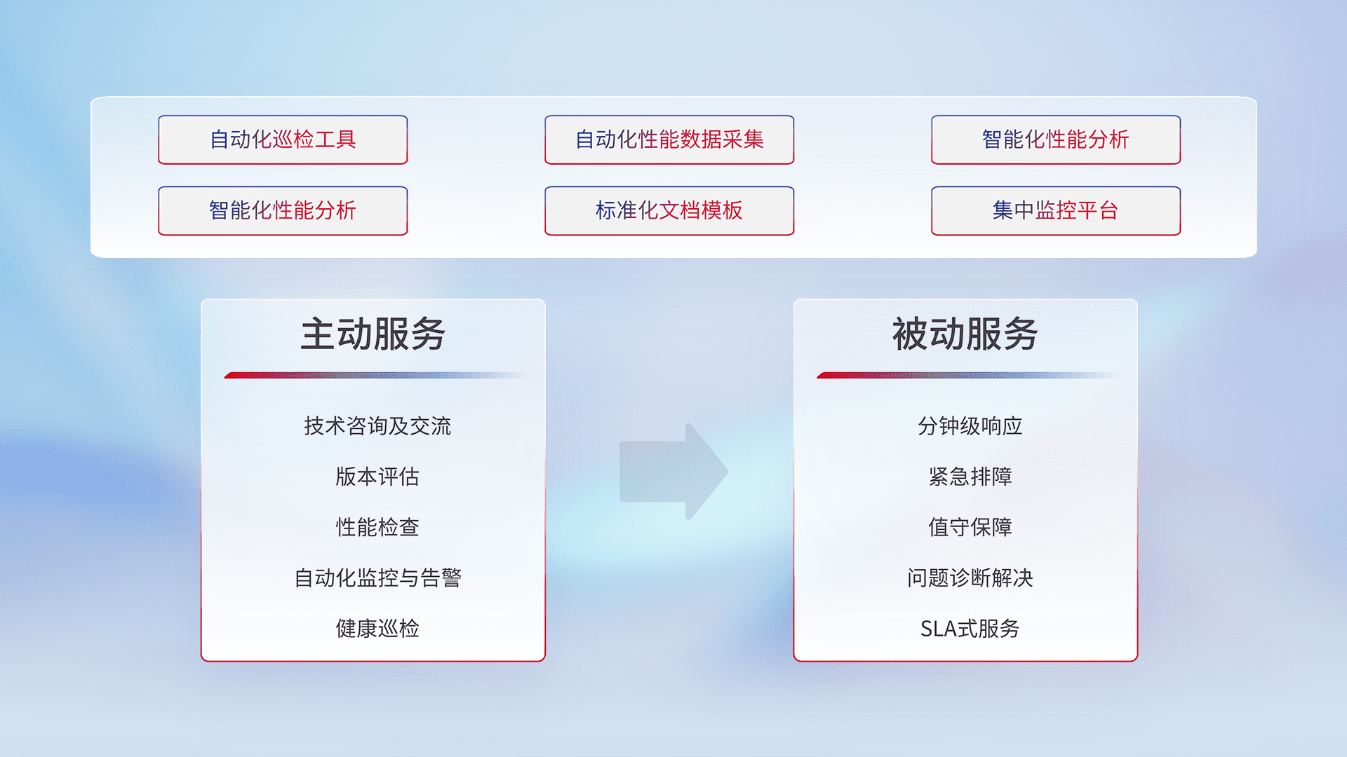 智能化工具和标准化文档,,保障服务质量,,,,提供主动服务(包含技术咨询、、、版本评估、、、、性能检查、、自动化监控与告警、、健康巡检)和被动服务包含(分钟级响应、、、紧急排障、、值守保障、、、问题诊断解决、、SLA服务)。。。。